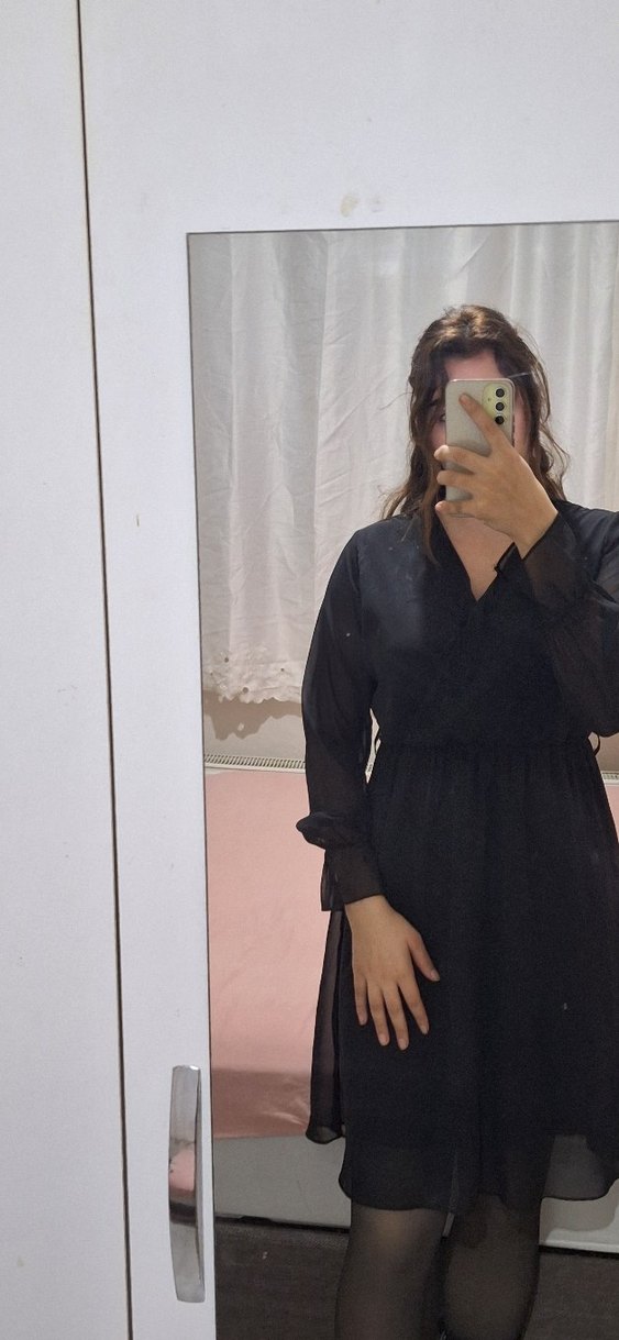 Siyah midi elbise, V yakalı ve uzun transparan kollara sahiptir. Gevşek kesim ve ipek gibi yumuşak kumaştan yapılmıştır, gotik tarz için uygundur.