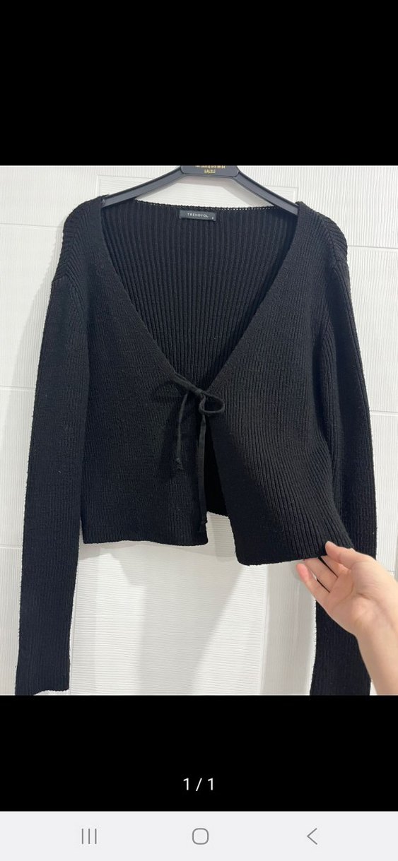 Siyah, triko, v yakalı, uzun kollu ve önden bağlamalı, midi boy, dar kesim kadın hırkası. Rahat, trend ve gotik tarzlara uygun.