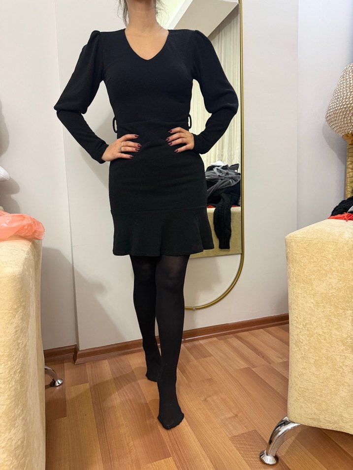 Siyah, V yakalı ve uzun kollu, bel detaylı Triko kumaştan mini elbise. Ofis için uygun, kemer takılabilir şık bir model. ister günlük ister şık