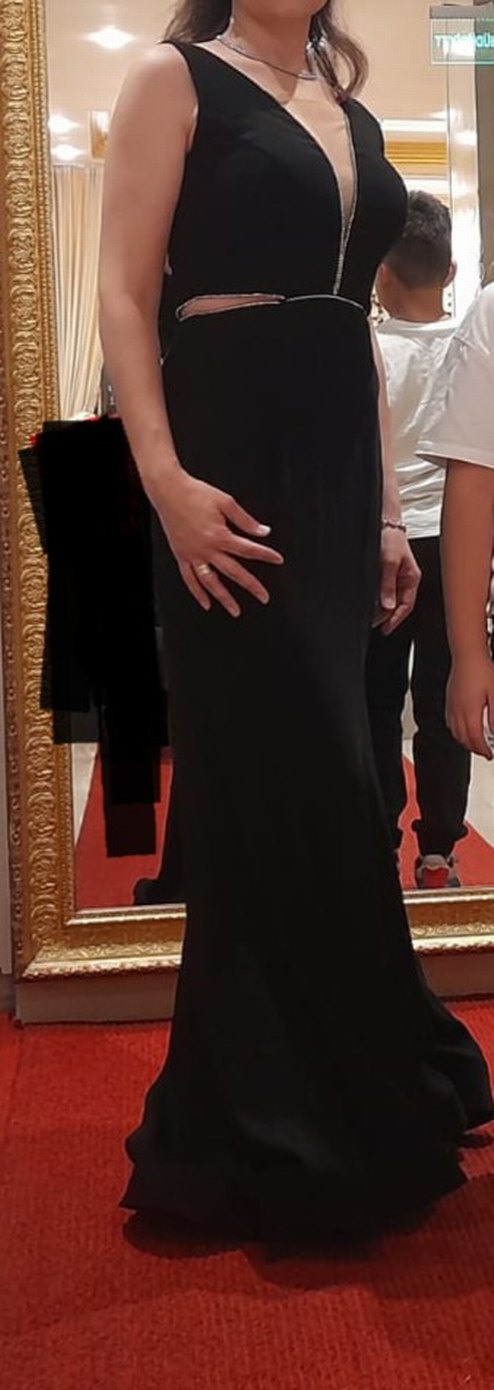 Siyah, V yakalı ve kolsuz, fermuarlı detaylı, taş işlemeli uzun ve vücuda oturan abiye elbisedir. Parti için uygundur. Dilerseniz taşları ve göğüs kısmındaki tülü çıkarabilirsiniz. Elle dikili.