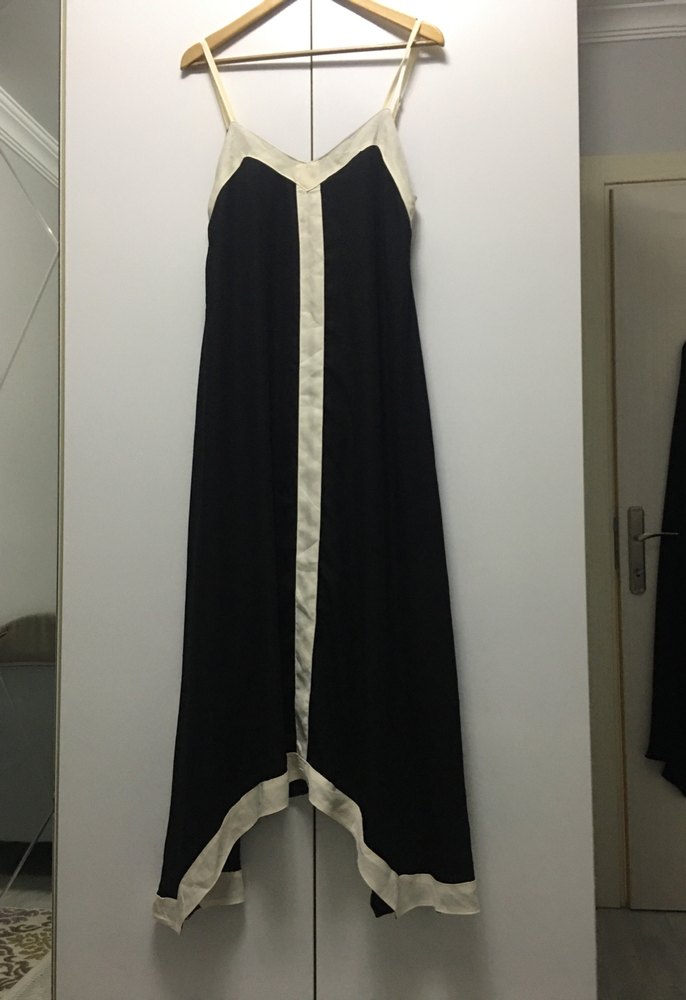 Siyah, saten dokulu, uzun askılı ve V yakalı elbise, drapeli ve kontrast açık renk detaylı, regular fit tasarım sunar.