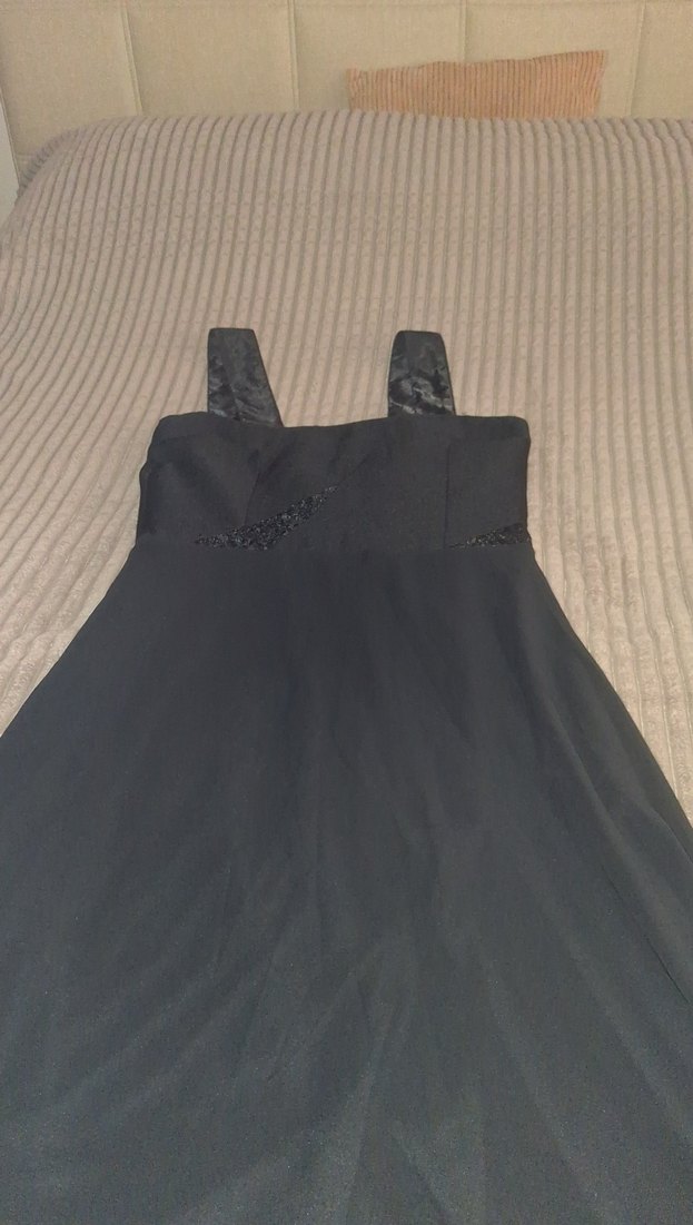 Siyah, askısız, V yakalı uzun elbise, yumuşak sentetik kumaştan, bol kesim ve drapeli tasarımla, romantik akşamlar için uygundur. boyu 132 cm göğüs 43 cm
