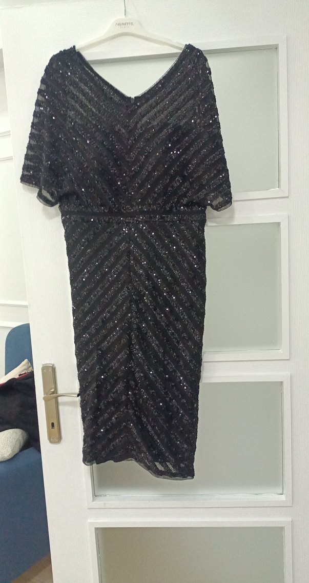 V yakalı, drapeli, orta boy siyah abiye elbise. Oturmalı kesimi ve kısa kollu desenli, karanlık ve göz alıcı parti tarzı sunar.