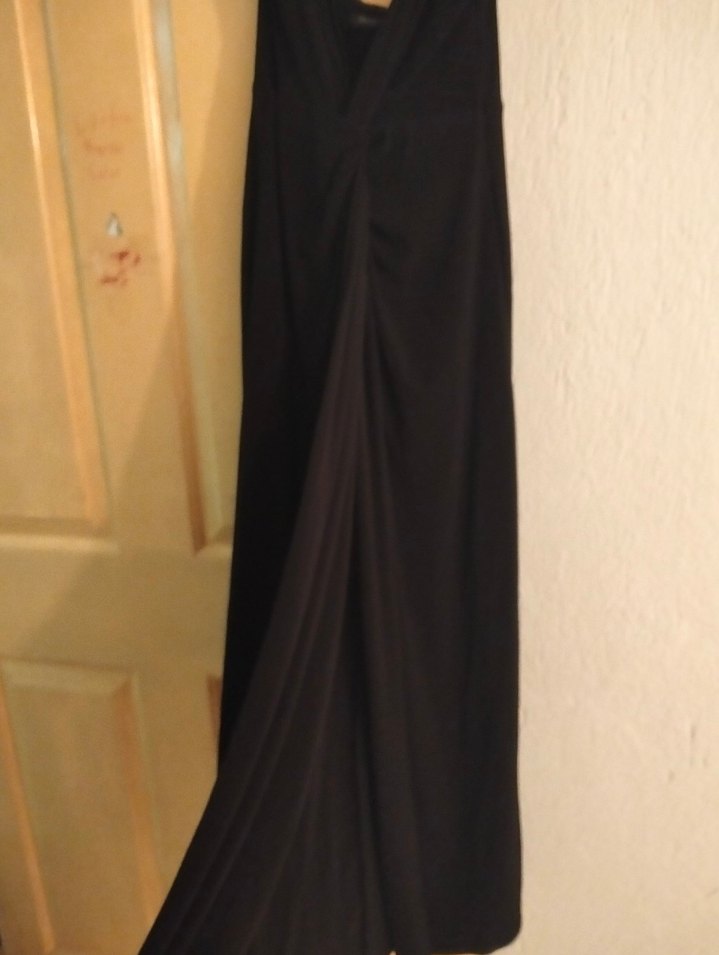 Siyah, uzun, kolsuz, V yakalı ve drapeli tasarıma sahip elbise. İpeksi kumaştan, regular fit ve minimalist gotik tarzda, ofis için uygun.