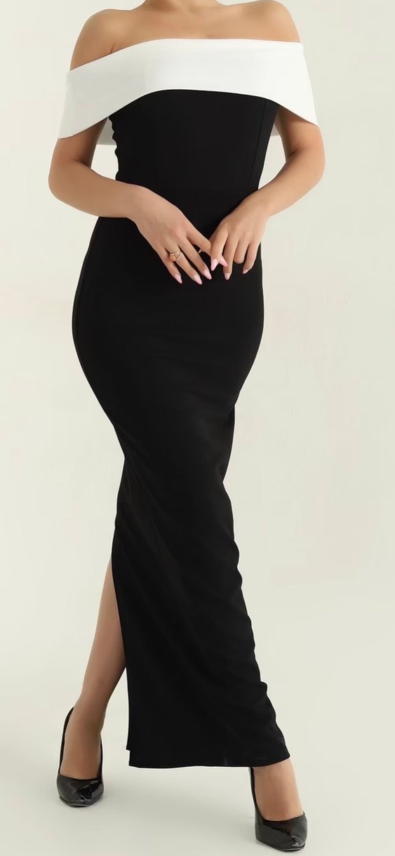 Siyah, uzun ve v yakalı bu dar kesim elbise, ince askılı kollara ve drapeli tasarıma sahiptir. İpeksi kumaştan yapılmış, gotik ve göz alıcı bir tarz sunar. Romantik akşamlar için uygundur.