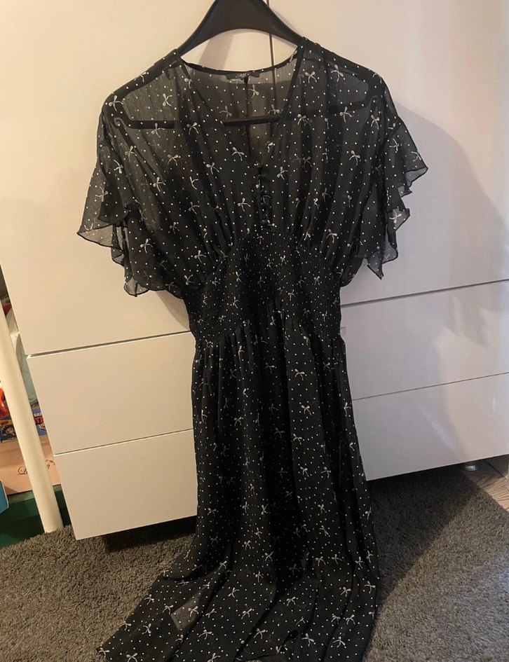 Siyah, V yakalı ve kısa kollu uzun elbise. Rahat kesimli, drapeli ve baskılı desene sahip yumuşak sentetik kumaftan üretilmiştir. Bohem ve gotik tarzda.