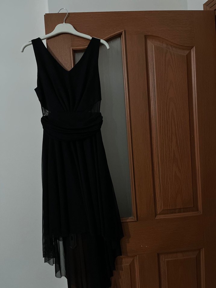 Siyah, V yakalı, kolsuz ve drapeli detaylı uzun elbise. Pürüzsüz sentetik kumaştan, fitted kesimle gotik tarz ve partiler için uygun.