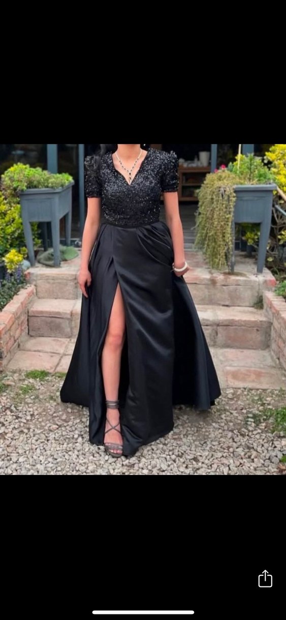 V yaka, kısa kollu, drapeli ve yırtmaçlı siyah uzun elbise. Klasik gotik tarzıyla düğün gibi özel anlara uygundur.