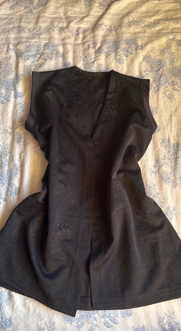 Siyah, V yakalı, dökümlü uzun yelek. İpek gibi kumaş, salaş kesim ve kolsuz tasarım içerir. Gotik tarz için uygundur.