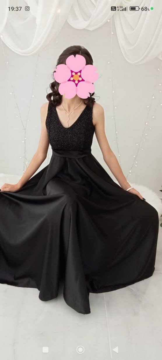 Siyah, V yakalı, drapeli etekli, uzun ve sıkı kesim abiye elbise. İnce askılı kolları ile şık ve klasik bir görünüm sunar. üstü simli kumaş dan dır 2 saat giyildi xs bedene uyumlu dur indirim payı vardır