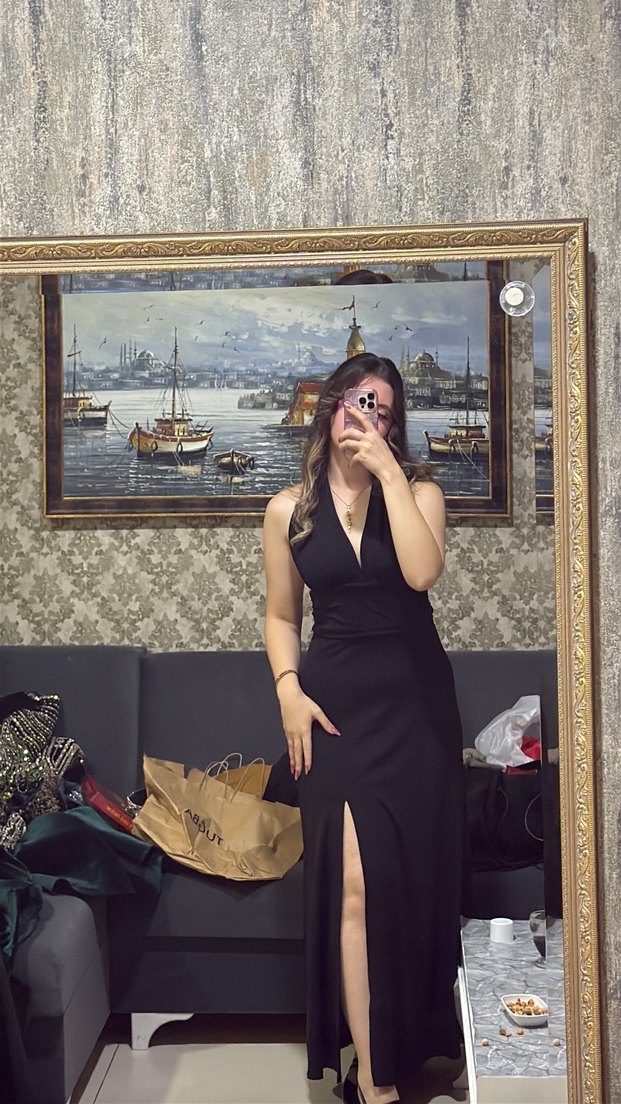 Siyah uzun elbise, V yakalı ve askılı, yırtmaçlı, ipeksi kumaştan, cesur parti tarzı için uygun.