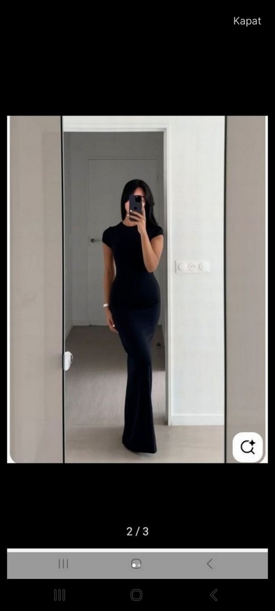 Siyah, v yakalı ve kısa kollu, uzun ve vücuda oturan bu elbise, ipeksi dokusuyla minimalist gotik tarzda, ofis için şık ve rahat bir seçimdir.