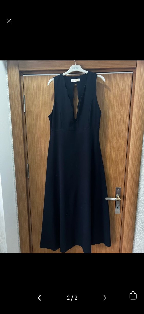 Lacivert uzun elbise, V yaka, kolsuz ve yırtmaçlıdır. Düzgün sentetik kumaştan üretilmiş olup, ofis kullanımı için uygundur.