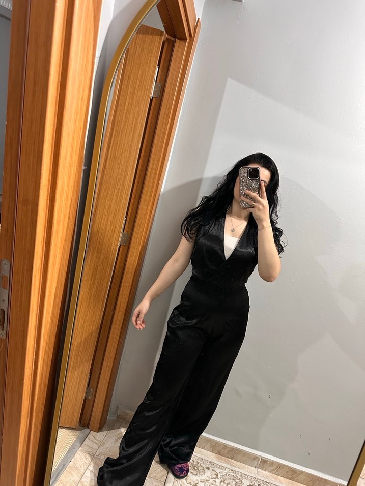 Siyah, V yakalı ve askılı kollu, parlak ve ipeksi kumaştan yapılmış, fit kesim uzun tulum. Cesur ve şık parti tarzına uygun. ✨
