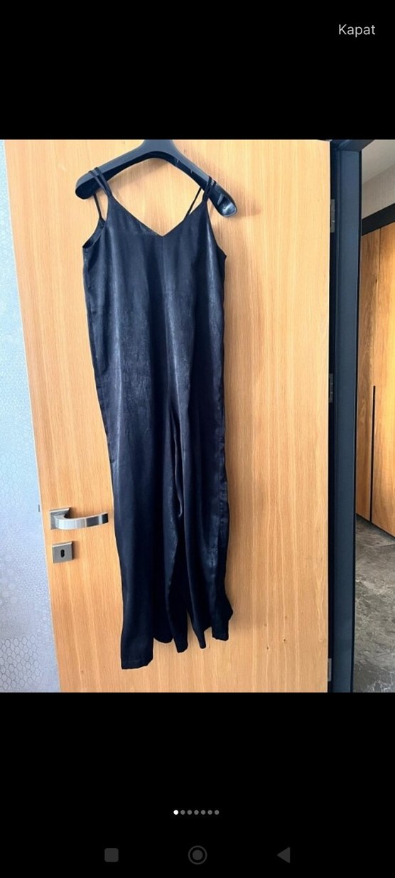Siyah, v yakalı, kolsuz uzun tulum, ipeksi dokusu ve dökümlü yapısıyla günlük kullanıma uygun minimalist bir tarza sahiptir.