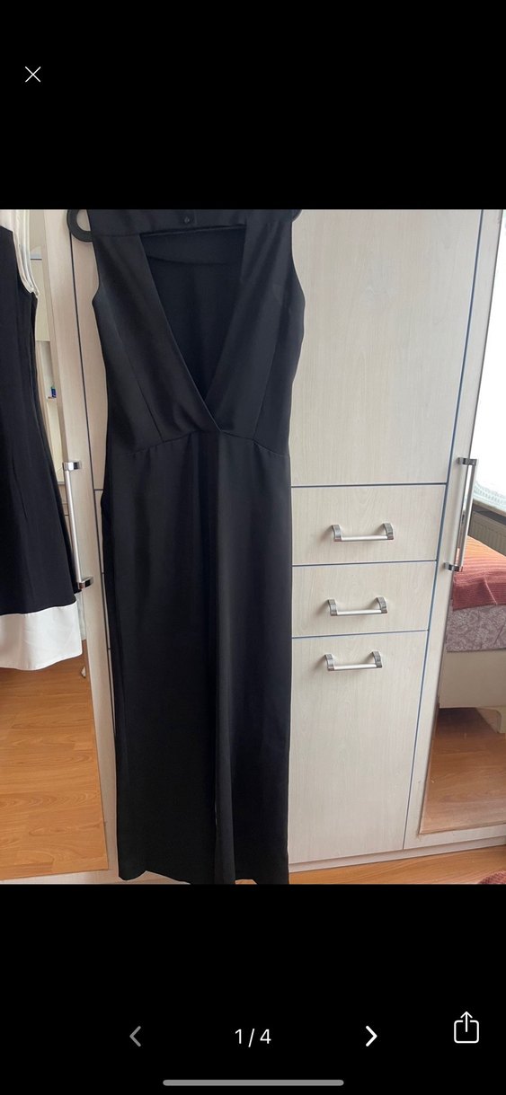 Siyah tulum, kolsuz ve V yakalı sırt tasarıma sahip, detayıyla sade ve uzun kesimdir. Ofis için uygun, sentetik yumuşak kumaştan yapılmıştır.
