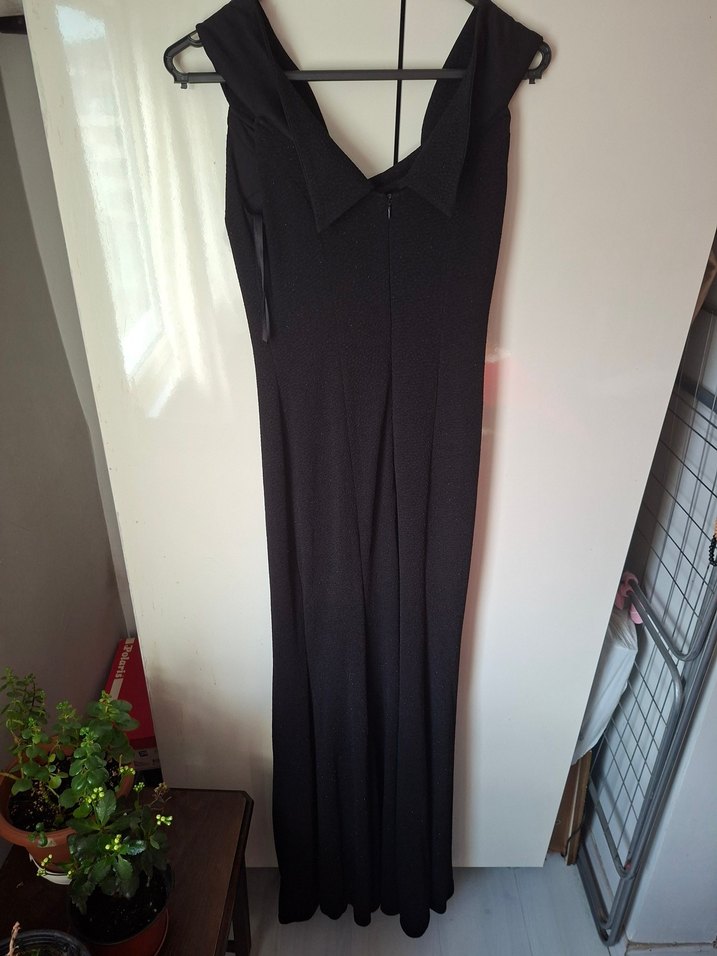 Bu siyah uzun tulum, drapeli V yakası ve kolsuz tasarımıyla, sentetik kumaştan yapılmış, ofis için şık gotik tarzda fit kesimdir.