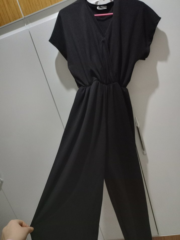 Siyah renkli, V yakalı ve kısa kollu kadın tulumu, dökümlü tasarımı ve bol kesimiyle rahat bir görünüm sunar. Sokak stili ve günlük kullanım için uygundur. ürünün ön kısmı toplu iğne ile tuturulmuştur kemer takılabilir