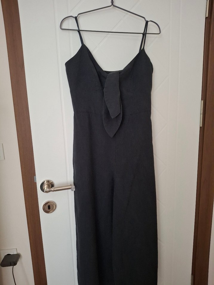 Siyah keten tulum, V yakalı ve ince askılıdır. Ön kısmında fiyonk detay bulunur. Rahat kesimli, bol paçalı, romantik akşamlar için uygun, bir ya da iki kez giydim, orijinal ürün.