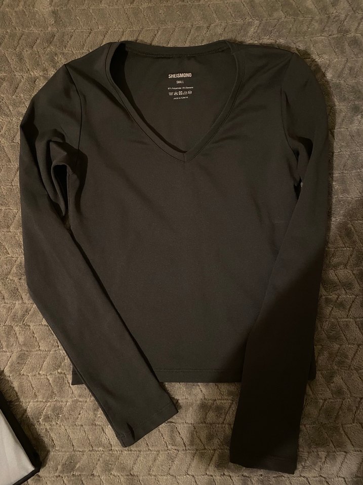 Siyah, V yakalı, uzun kollu ve vücuda oturan hamile tişörtü. Normal boyda ve sentetik kumaştan, günlük kullanıma uygun sade şık tarzda.