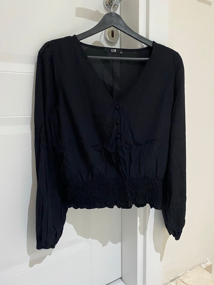 Siyah kumaştan, uzun kollu, V yakalı ve düğmeli ön kısmı olan bol kesim bluz. Bel kısmı lastiklidir, rahat ve şık bir görünüm sunar.