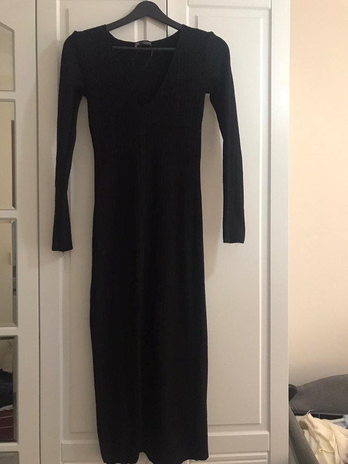 Siyah uzun elbise, V yakalı ve uzun kollu dar kesimdir. Pürüzsüz sentetik kumaştan yapılmış, minimalist gotik tarzda, zahmetsiz şıklık sunar.