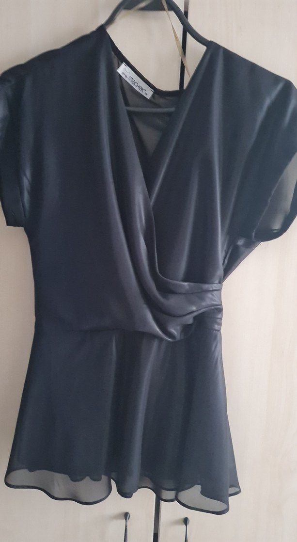 Siyah, drapeli ve V yakalı bu bluz, ipeksi kumaştan üretilmiş, kısa kollu ve uzun boylu, ofis için uygun gotik tarzda şık bir modeldir.