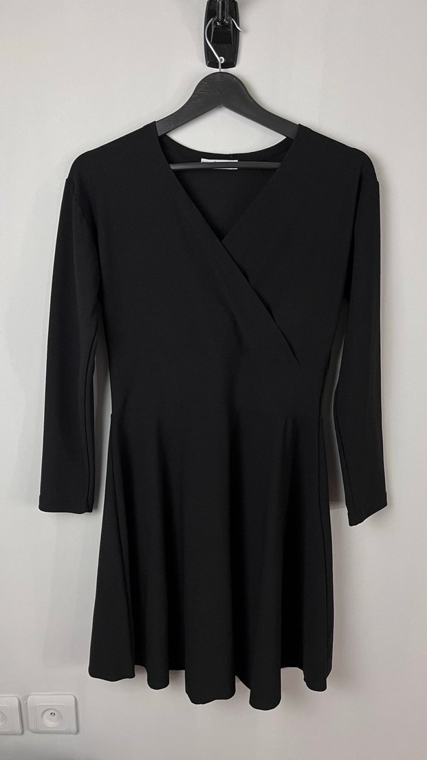 Siyah renkli, V yakalı, uzun kollu, drapeli elbise. Midi boyda, fitted kesim ve minimalist goth tarzında, ofis için uygun.