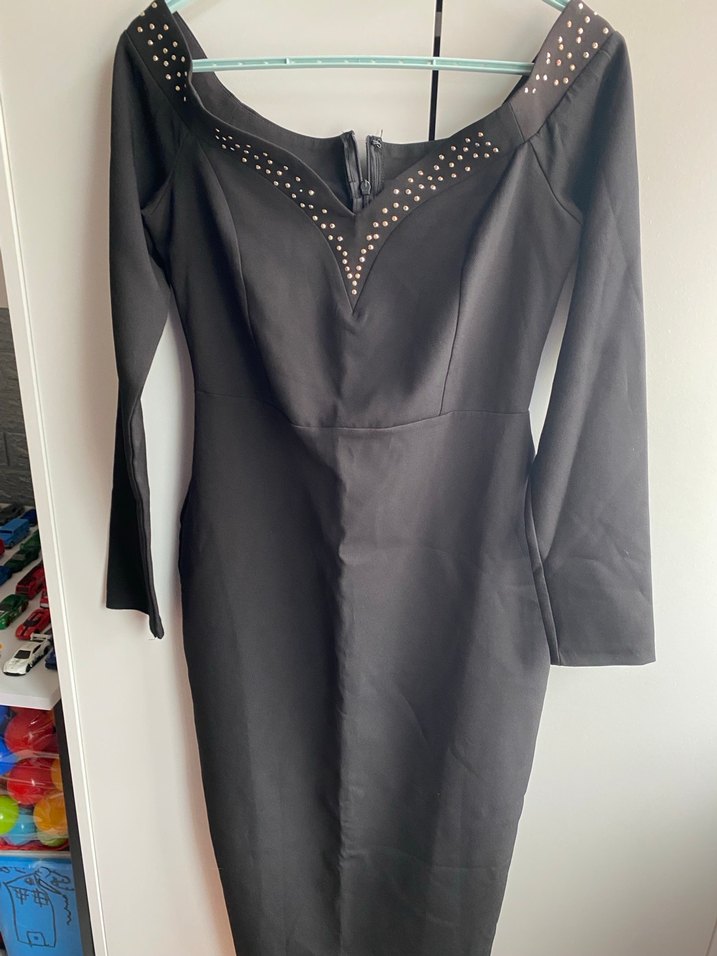 Siyah, v yakalı ve payet detaylı uzun kollu bu dar kesim gece elbisesi, ofis ortamı için şık ve zarif bir görünüm sunar. 1 kez denedım dar geldi arkasındaki yırtmaç biraz söküldü hiç kullanmadım