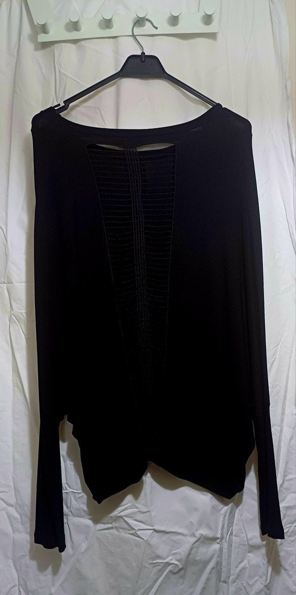 Uzun kollu, V yakalı ve dökümlü detaylı siyah bluz. Sentetik kumaştan yapılmış, günlük kullanım için uygun gotik tarzda.