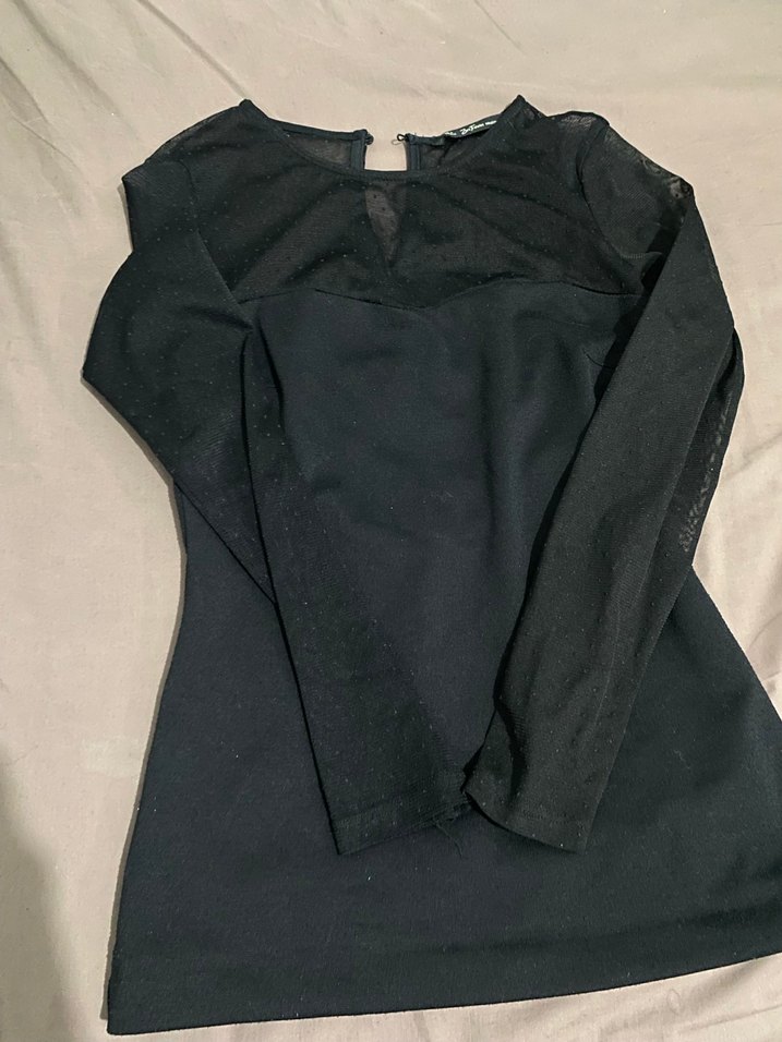 V yakalı ve uzun kollu, siyah ve ince sentetik kumaştan yapılmış, vücuda oturan gotik tarzda bluz. Ofis kullanımı için uygundur.