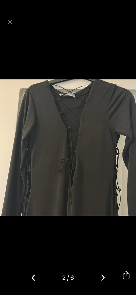 Siyah, v yakalı ve uzun kollu bu dar kesim elbise, elastik yan bağcıklarıyla gotik tarz sunar, romantik akşamlar için uygundur.