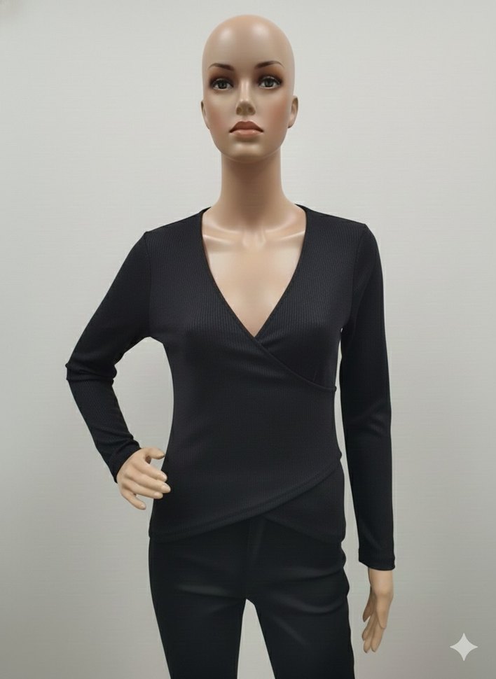 Siyah V Yakalı Uzun Kollu Kadın Bluz