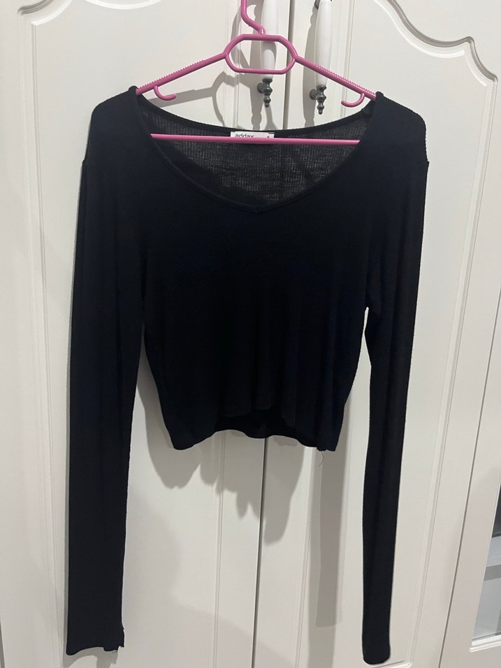 V yaka, uzun kollu ve vücuda oturan siyah bluz, yumuşak sentetik kumaştan üretilmiştir. Minimalist tasarımıyla rahat ve şık bir görünüm sunar.