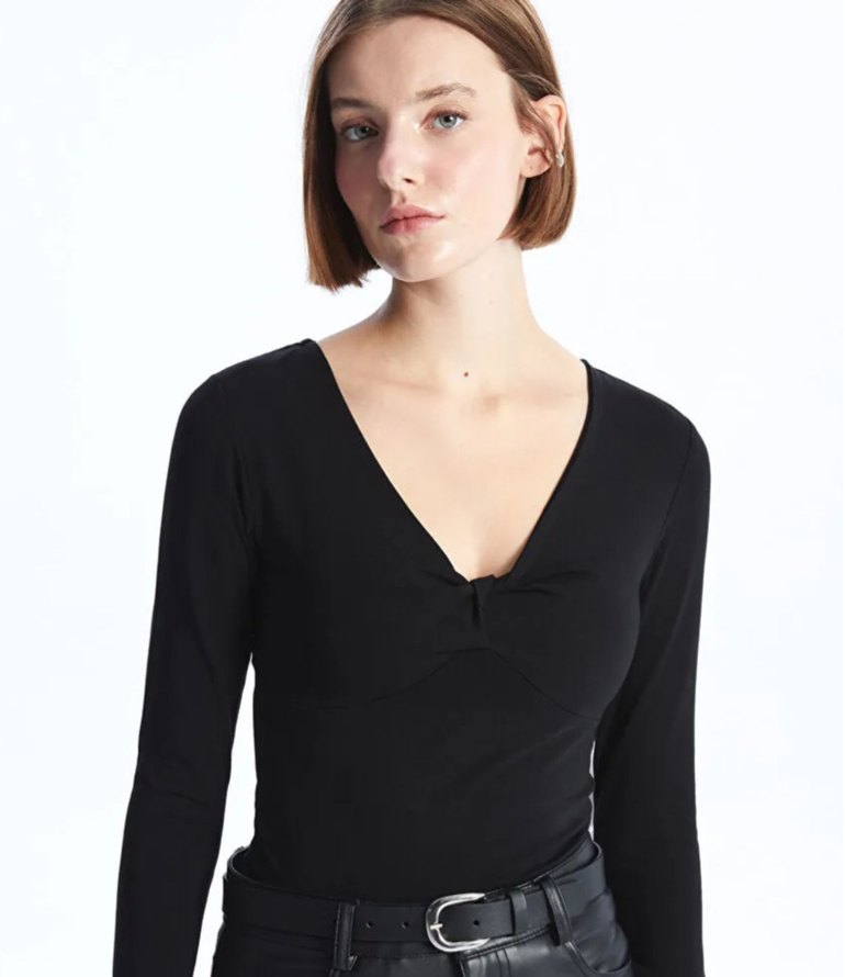 Siyah V Yakalı Uzun Kollu Kadın Bluz