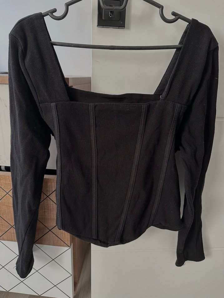 Siyah, v yakalı ve düğmeli uzun kollu, midi boy, sentetik kumaştan yapılmış, vücuda oturan kadın bluzu. Günlük kullanıma uygun, gotik tarzda.