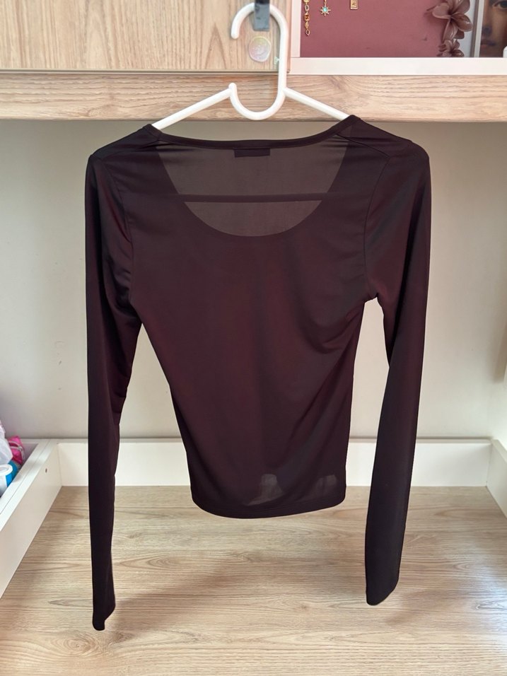 Siyah renkte, uzun kollu ve V yakalı, ince kesim kadın bluz. İpeksi kumaştan, midi boyunda, desen içermeyen bluz