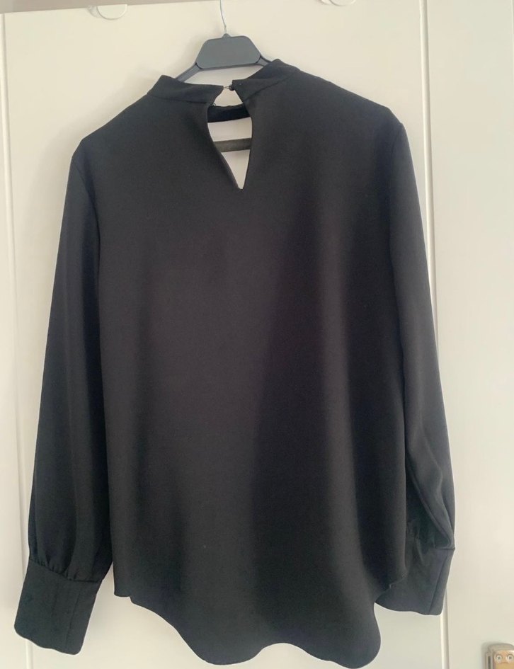 Siyah, V yakalı ve uzun kollu düğmeli manşetlere sahip kadın bluzudur. Rahat kesimi ve desensiz tasarımıyla ofis kullanımı için uygundur. Kumaşı sentetik ve düzgündür.