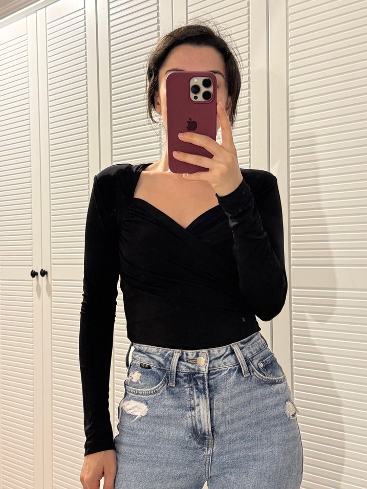 Bu siyah, v yakalı ve uzun kollu fitted bluz,Alt kısımdan çıtçıtlı
