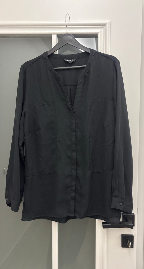 Siyah, V yakalı, düğmeli önlü, uzun kollu kadın gömleği. İpek gibi dokusu, bol kesim ve normal midi boyda, iş ortamına uygun.