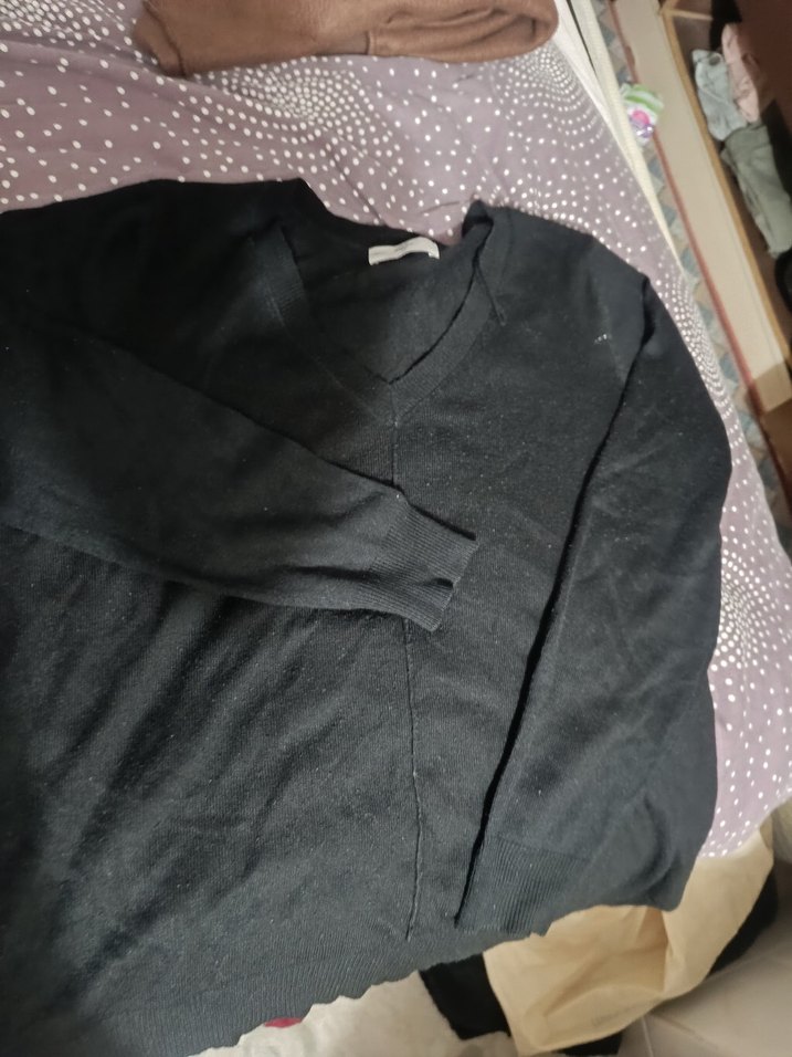 S/M beden siyah V yakalı, uzun kollu, rahat kesim triko, midi boy ve gündelik kullanıma uygun.