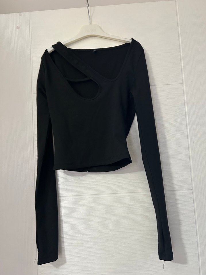 Siyah V Yakalı Uzun Kollu Kısa Bluz pencereli parmak gecirmeli