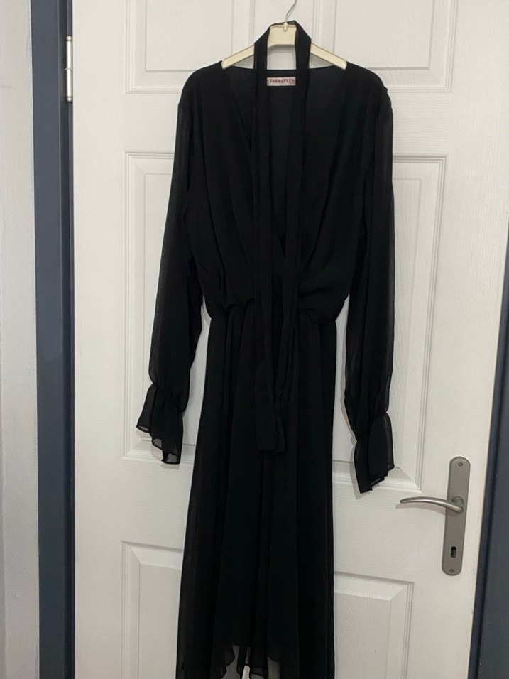 Siyah uzun elbise, V yakalı ve uzun kollu drapeli tasarıma sahiptir. Tül kumaştan, bol kesim, astarlı ve ofis için uygundur. 2-3 kere giyildi ve iyi durumdadır.