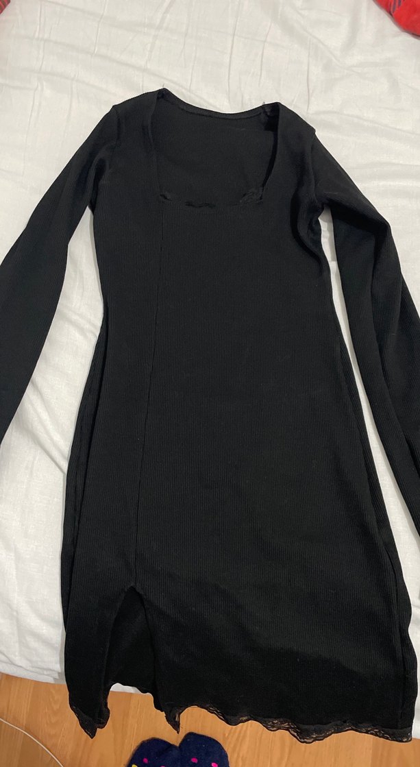 Siyah, uzun kollu, V yakalı midi elbise, yırtmaç detayıyla. Düz ve pürüzsüz sentetik kumaştan, minimalist goth tarzına uygun.