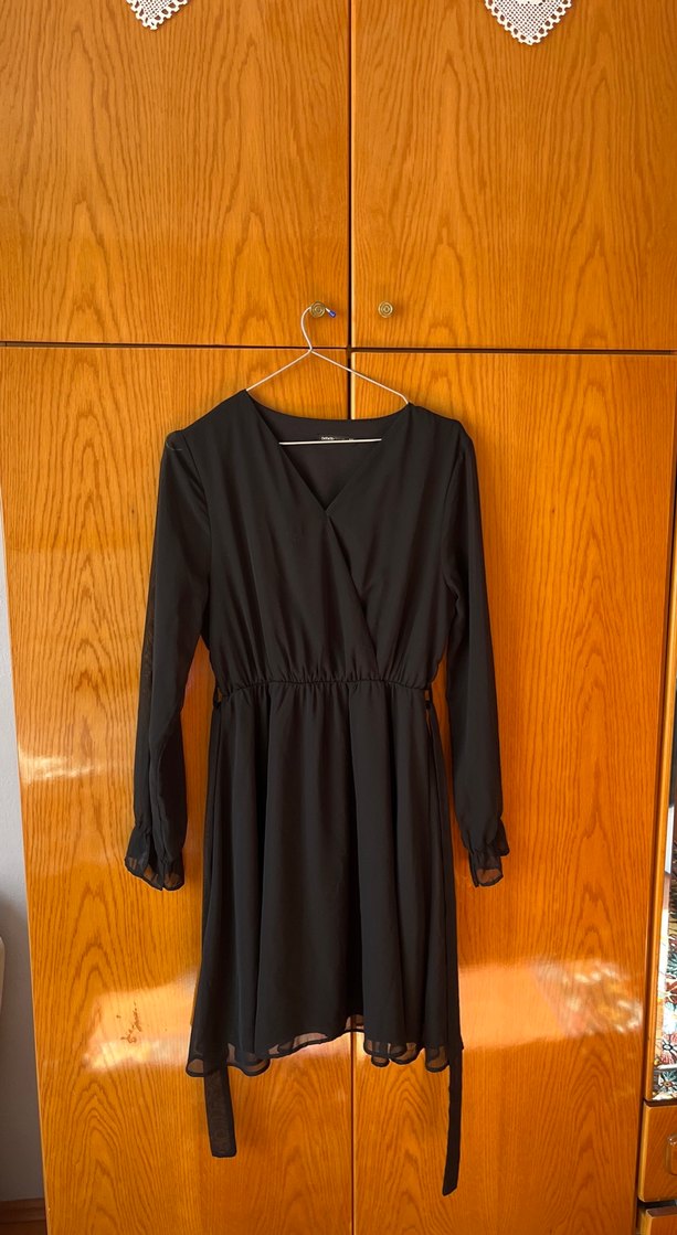 Siyah renkli, V yakalı ve uzun kollu midi elbise. Salaş kesimi ve dökümlü tasarımıyla ofis için uygun, ipeksi dokuda şık bir modeldir.