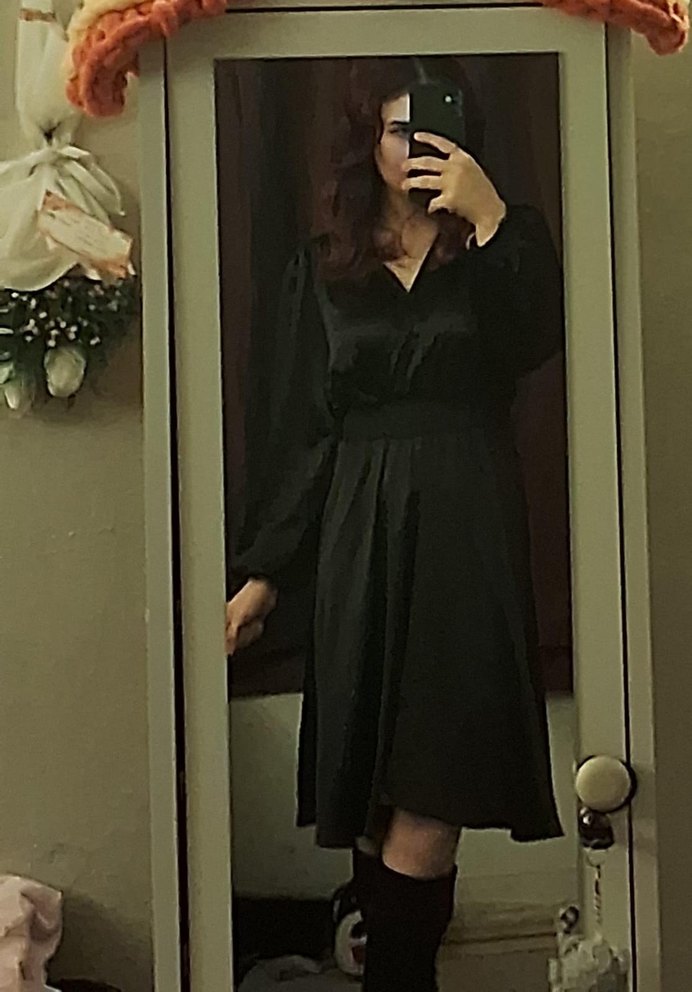 Siyah, ipeksi dokulu, drapeli midi elbise. V yakalı, uzun kollu ve bol kesimdir, ofis için uygun gotik tarzda. ufak bir izi var fotoğraftaki gibi