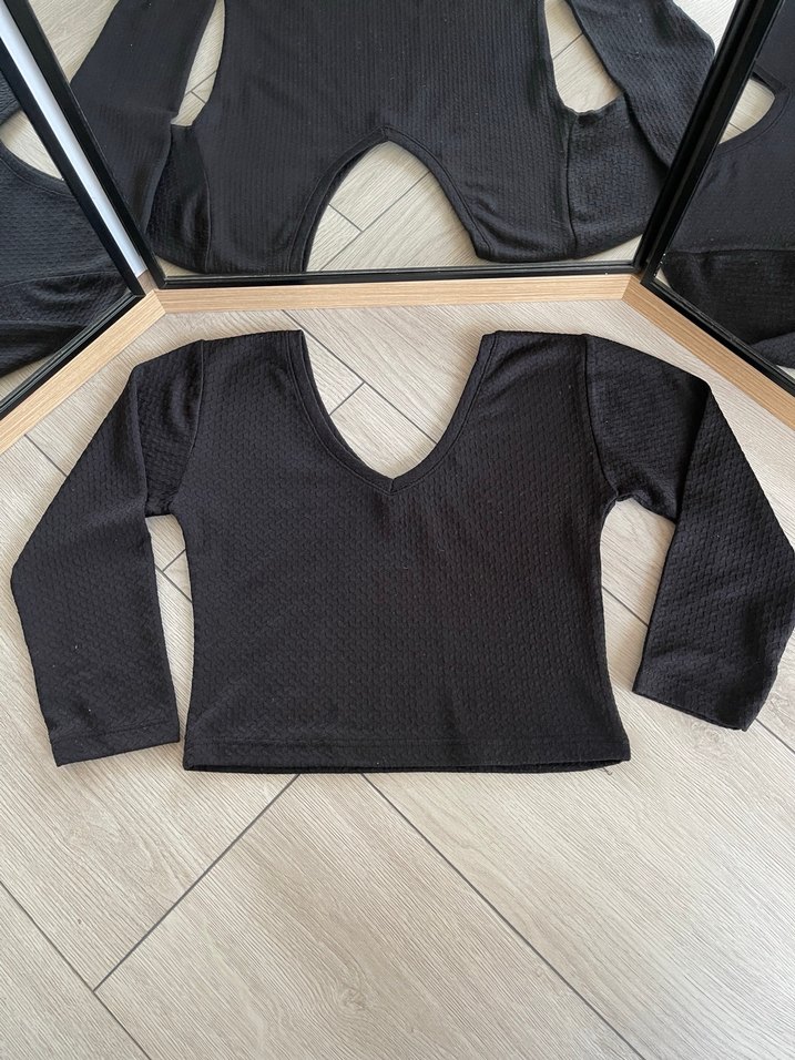 V yakalı, uzun kollu, siyah ve kısa kesim şık bluz. Düz ve rahat sentetik kumaştan, günlük sokak stili için uygun. Fotoğraflarda görüldüğü gibidir