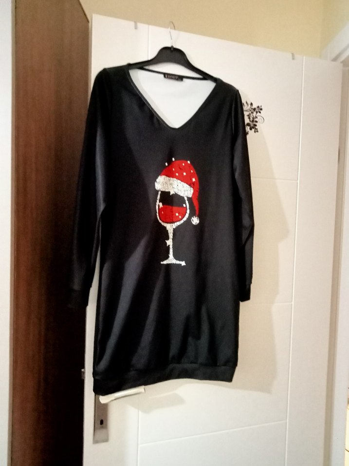 Siyah, V yakalı, uzun kollu ve bol kesim elbise Sentetik kumaştan, payetli baskılı tasarıma sahip, parti için uygun.