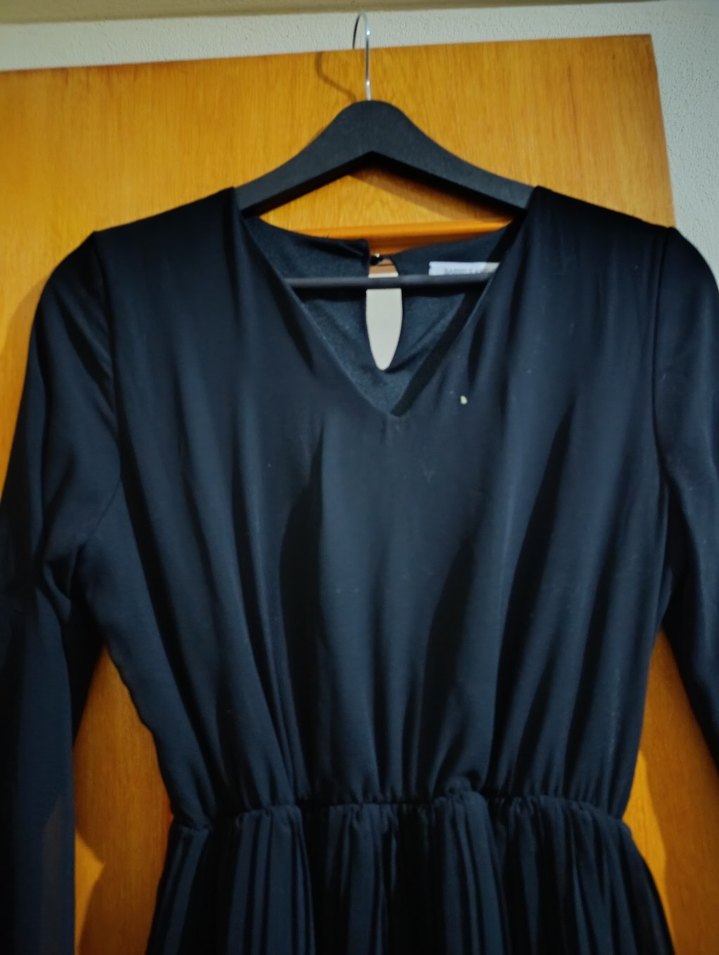 Siyah renkli, V yakalı ve uzun kollu bol kesim elbise. Yumuşak sentetik kumaştan, piliseli detaylı ve minimalist tarzda günlük kullanıma uygun.
