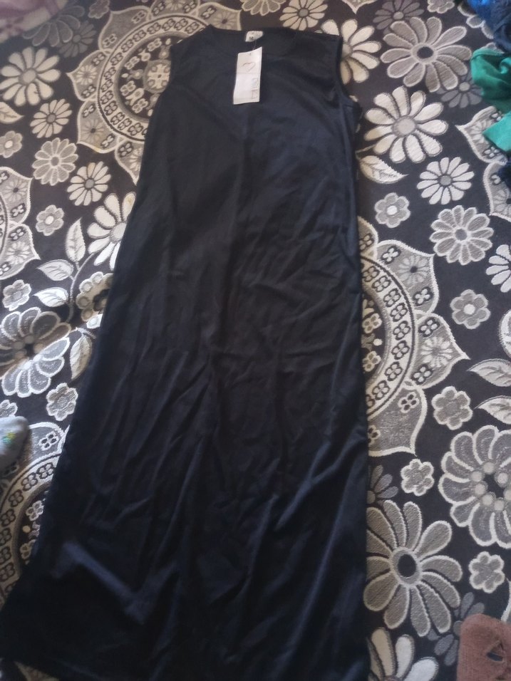Siyah, uzun, kolsuz ve V yakalı bu elbise, drapeli detaylara sahip ve yumuşak sentetik kumaştan üretilmiştir. Minimalist gotik tarz için uygundur.